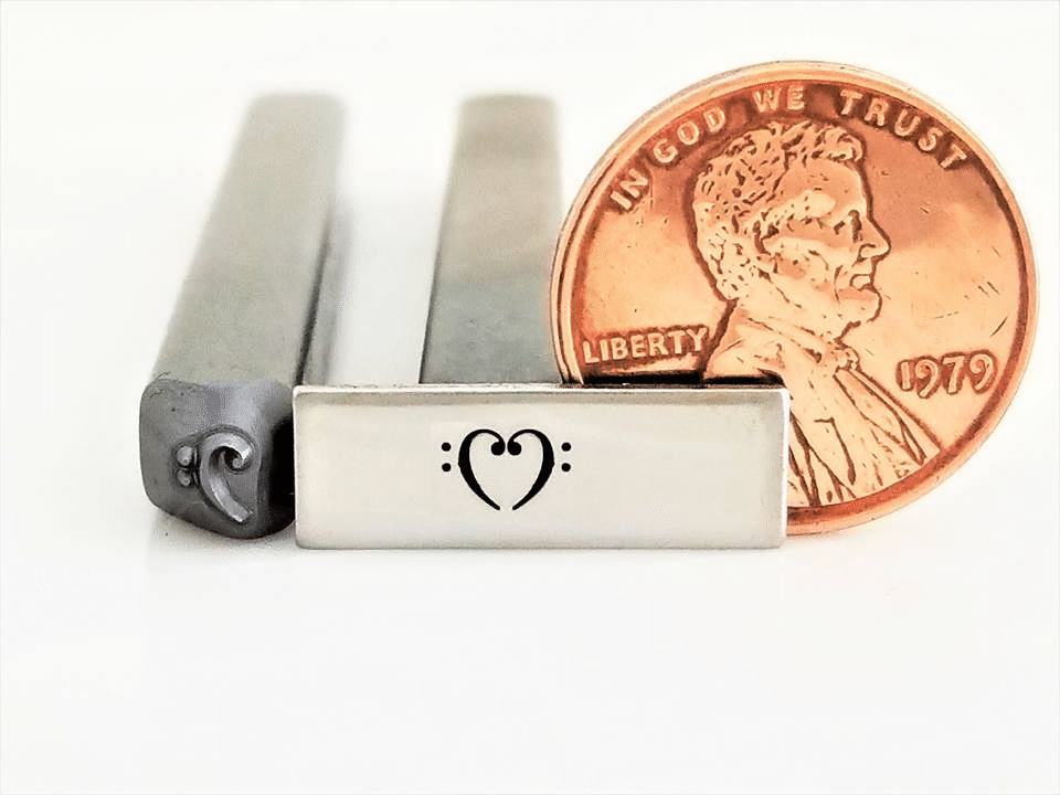 Music, music notes, bass clef, treble clef, instruments. What we love most about this hand stamp bass clef metal design stamp is that the two images stamped together makes a musical heart! All of our Simple Dimple stamps manufactured to be used on all metals, and are designed to fit in most ring jigs.