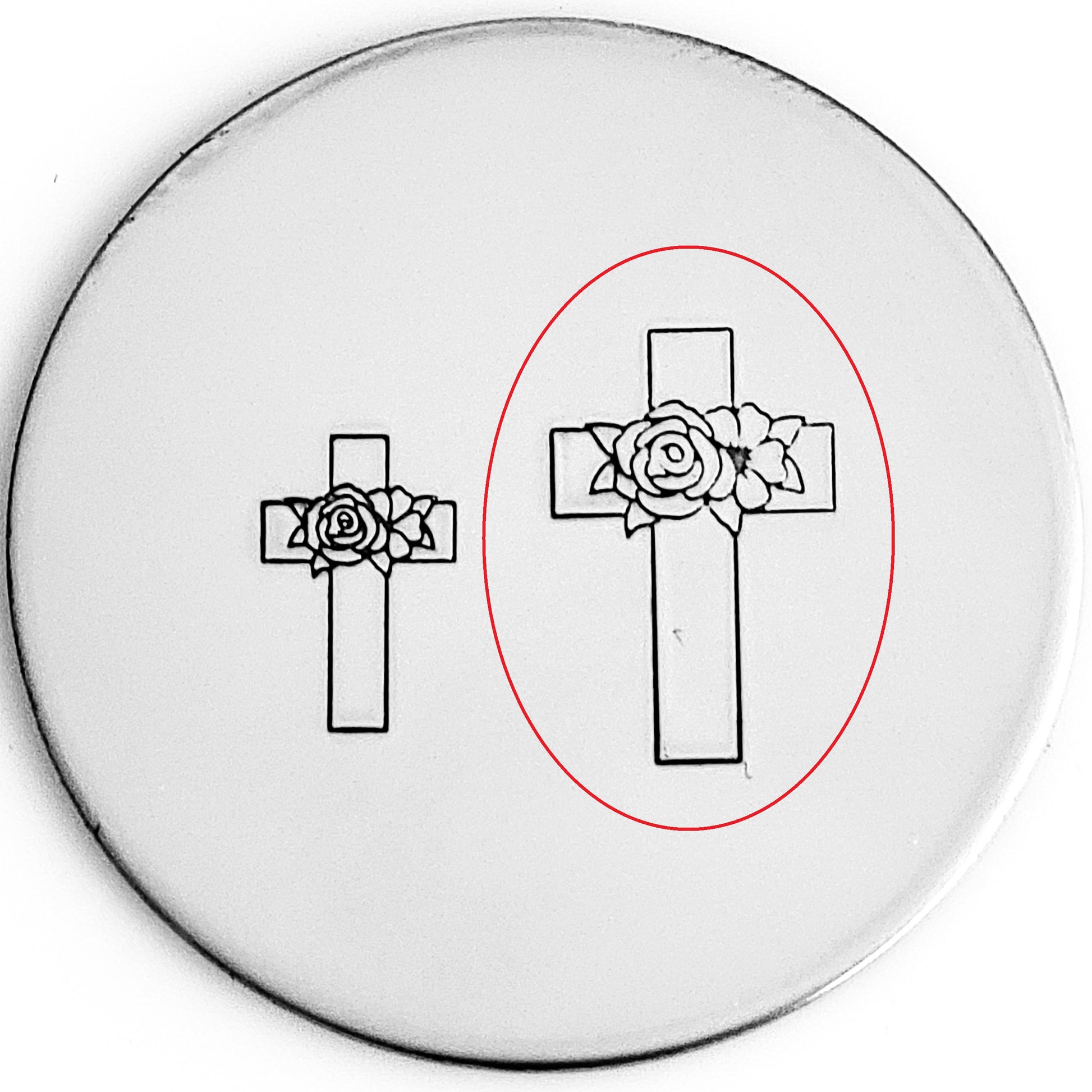 Broadening our collection of cross metal design stamps. Be sure to do a search on our website for "cross" to see which cross hand stamp styles we have in stock! This cross has flowers going across the cross.