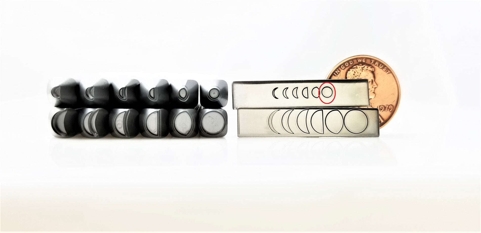 These simple moon phases come in two sizes: 2.5mm which is perfect for rings, and 5.5mm which is perfect for everything else (even 1/4" cuffs!).