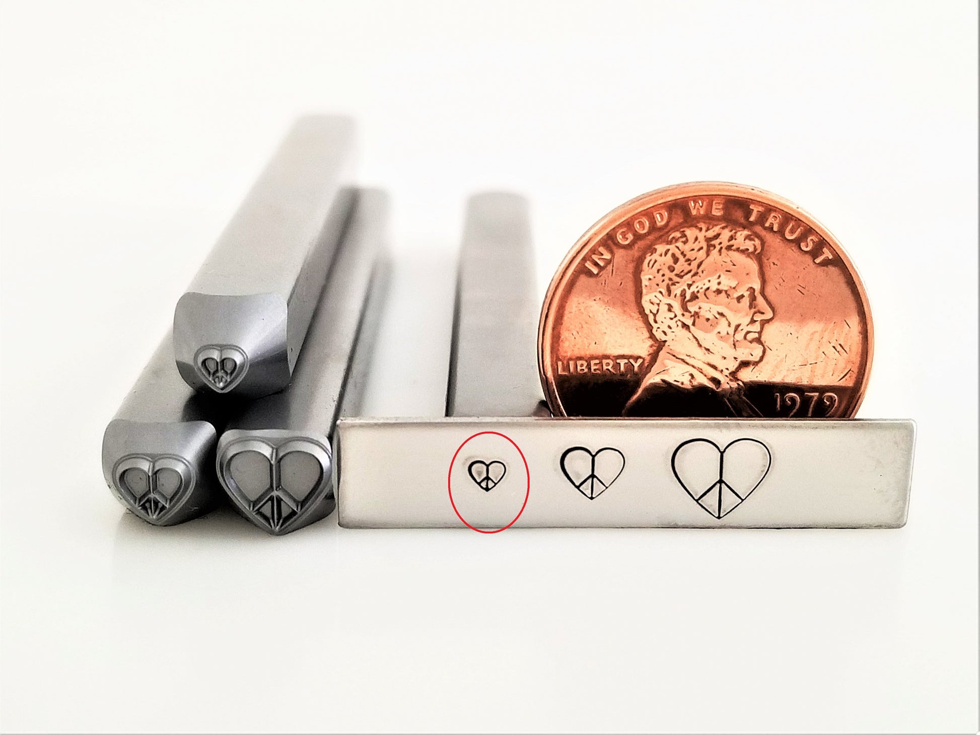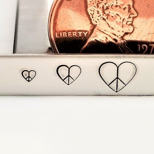 Not just your standard hand stamp peace symbol! We like to add a bit of love to our designs, hence, the peace heart metal design stamp!