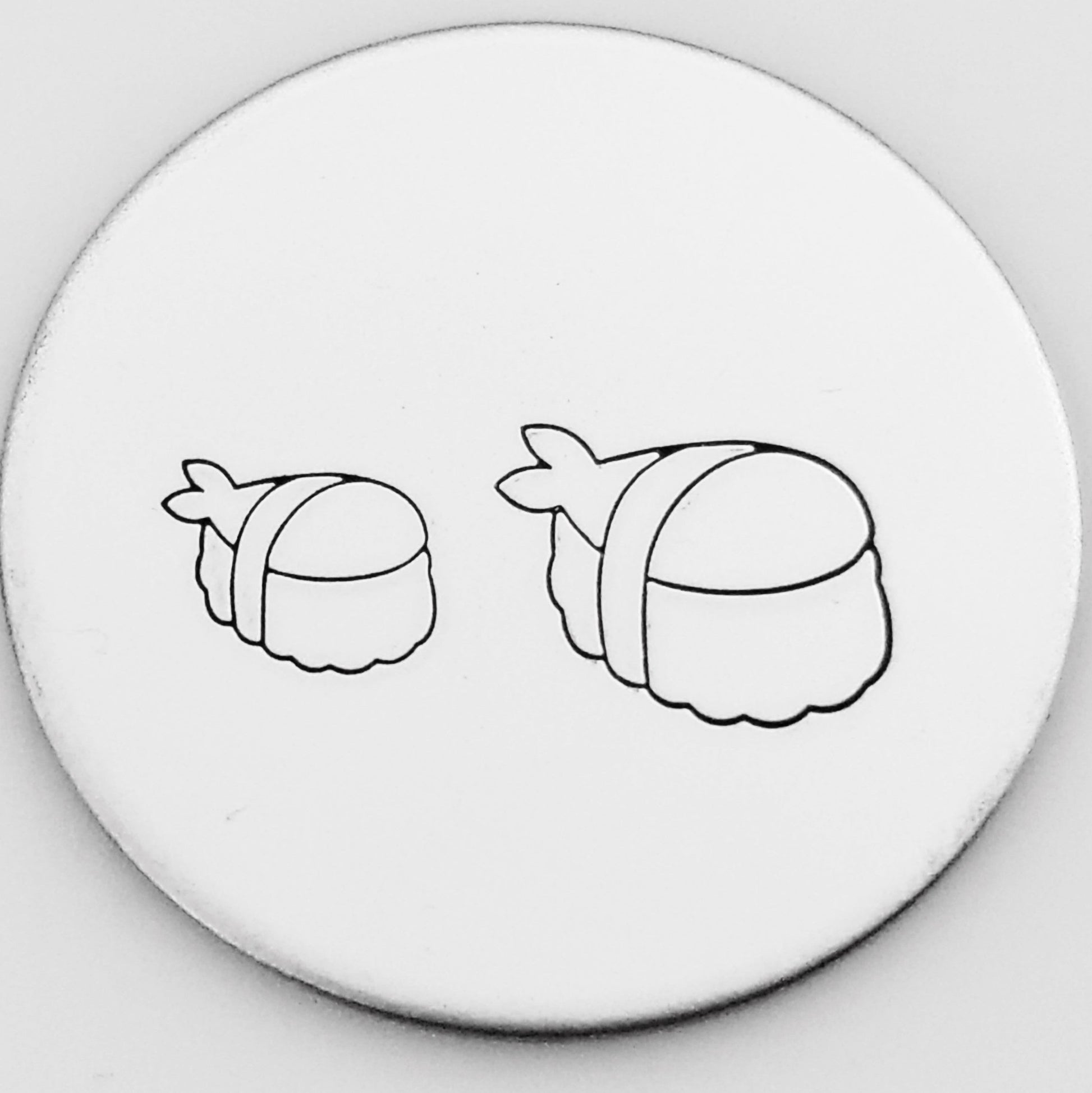 The perfect adorable sushi metal design stamp. Add the chopsticks, and eyes and smiley face, and you have a whole Kawaii look that can be hand stamped with any adorable text or design hand stamps!
